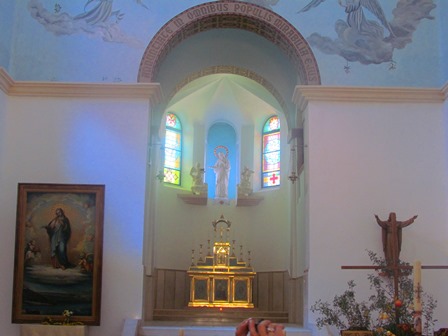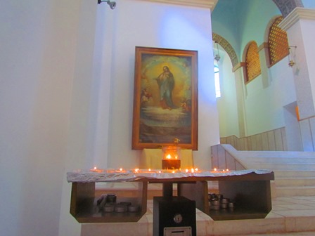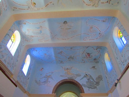 ניתן לראות כי על תקרת כנסיית המנזר כתוב "שלום לך מריה" (אווה מריה) ב- 300 שפות (כולל עברית ויידיש). תפילה זו חרוטה גם על שערי העץ ב-56 שפות, מעשה ידיו של אמן ערבי מהאזור.